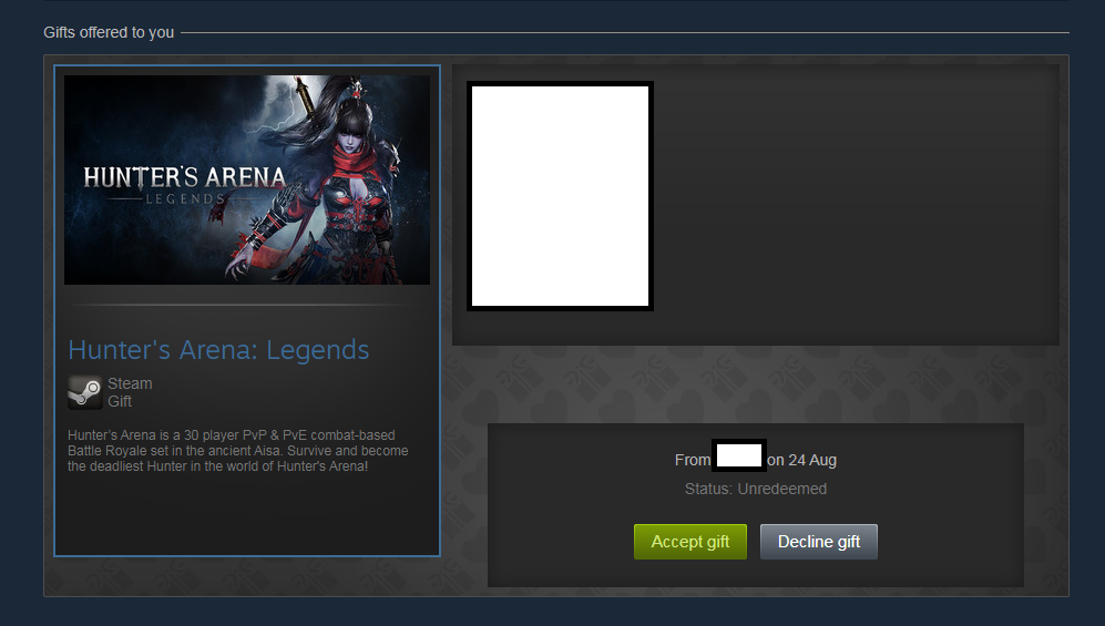 1. Purchase Hunter’s Arena: Legends on Steam as a gift for a friend and take a screenshot that looks something like this.(Screenshot Number 1)
