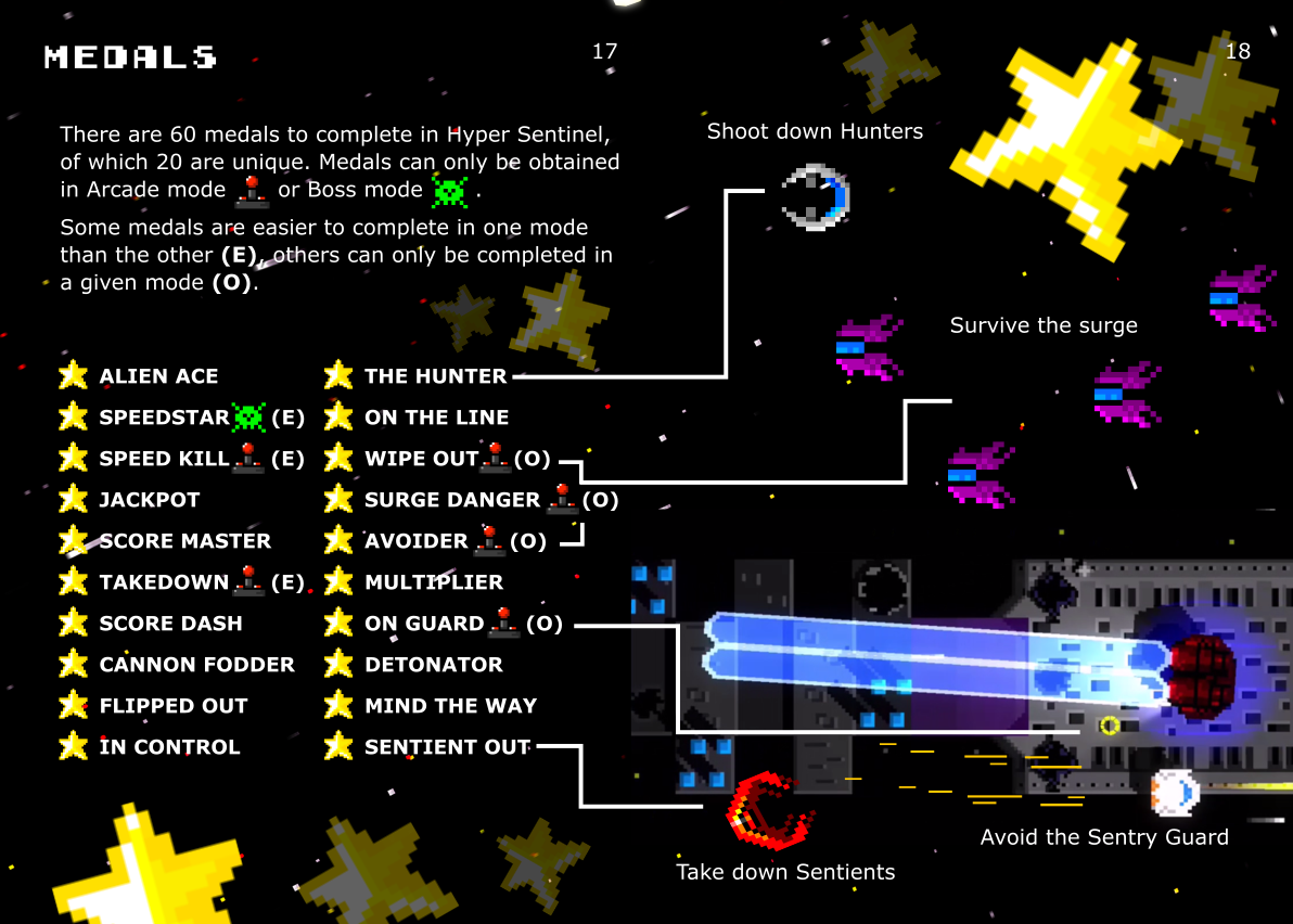 To 100% complete Hyper Sentinel, you will not only need to complete all 108 missions (all modes, all levels, all difficulties) but also to unlock all 60 medals. This handy guide will give you some pointers!