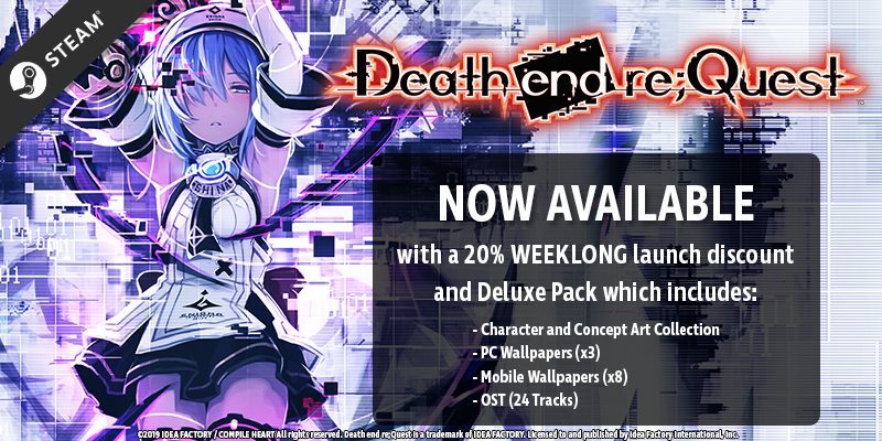 Log into World's Oddsey today! We're happy to announce that Death end re;Quest™  is NOW AVAILABLE for $49.99 on Steam® with a Deluxe Pack (purchased separately)! There is a WEEKLONG 20% OFF discount on both the game and Deluxe Pack! Users can save an additional 20% with the Deluxe Bundle (Game + Deluxe Pack) which has a permanent 20% OFF DISCOUNT.