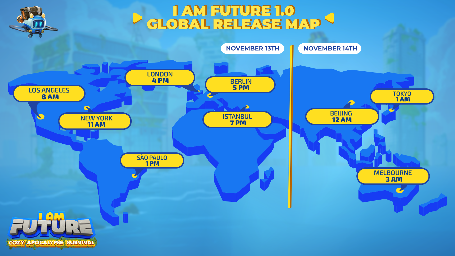 I Am Future invites you to build a rooftop base of your dreams, explore a mysterious world, start a farm, hire a team of cute robot minions, and make new friends, all while enjoying the chillest post-apocalypse ever.