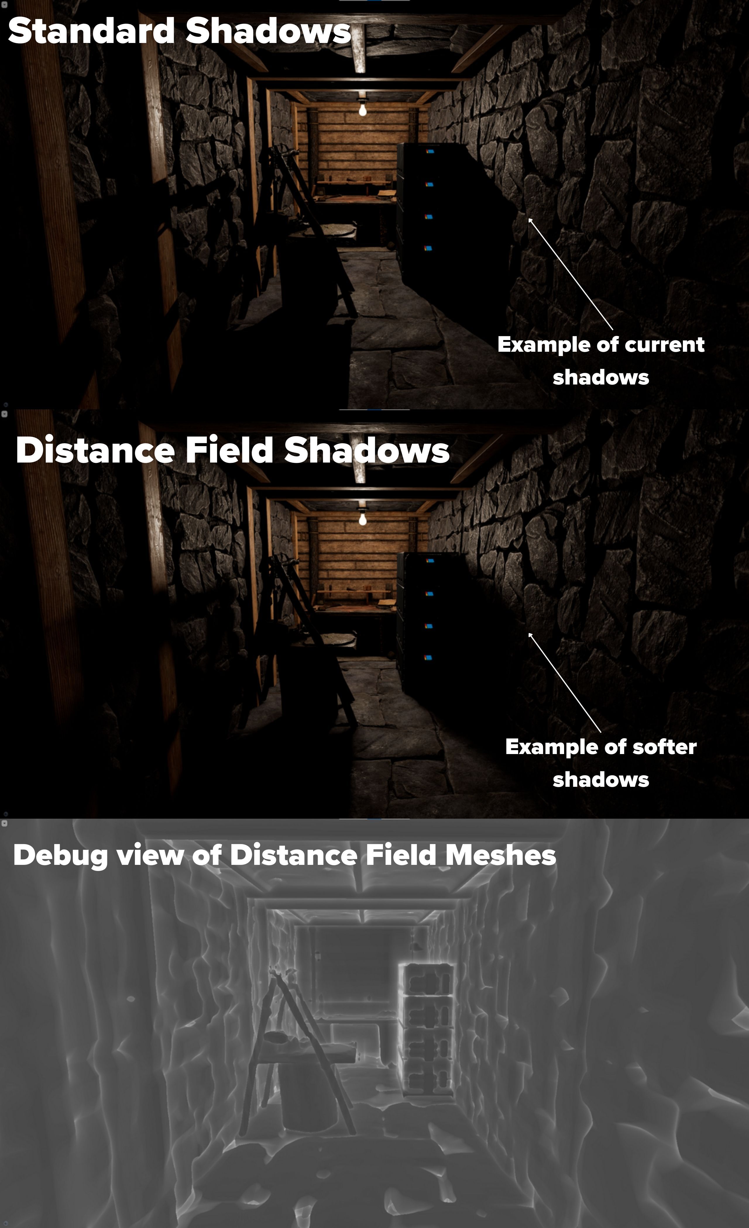 As discussed in last week's post, we were aware of some limitations with the Distance Field shadows, such as them not playing nicely with thin objects and not casting any shadows at all from Skeletal/Animated meshes. After much tinkering, we feel these issues have been addressed for the most part, but again, we welcome your feedback and reports of anything we may have missed.