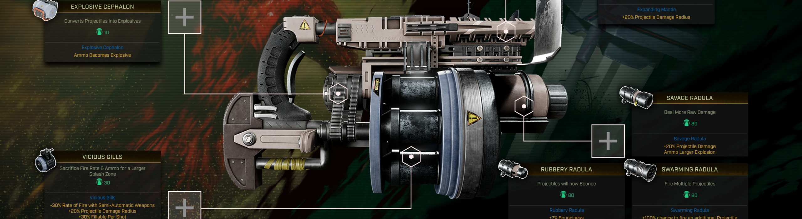 The Behemoth incorporates technology derived from experimentation on the Garganutan, particularly its impressive agility and strength. Attachments for this weapon incorporate stamina, speed, power, and strength boosts, but even some unique perks such as ‘Primal Blood’ which boosts carry capacity and reduces over-encumbrance penalties, and ‘Vampiric Blood’ which leeches health from its targets on impact.