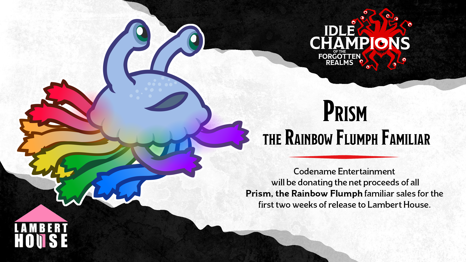 Codename Entertainment and Idle Champions are raising money for Lambert House and supporting LGBTQ+ youth with our Prism Rainbow Flumph Familiar!