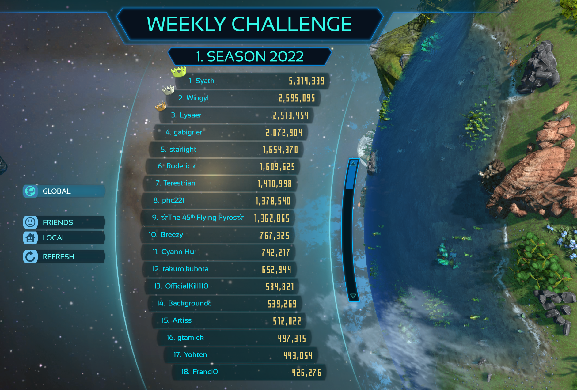 Hail to the winners of the first season 2022 of weekly challenges. These victors have forever inscribed their names in Imagine Earth's high score system. Fresh season just started, so take your chances!