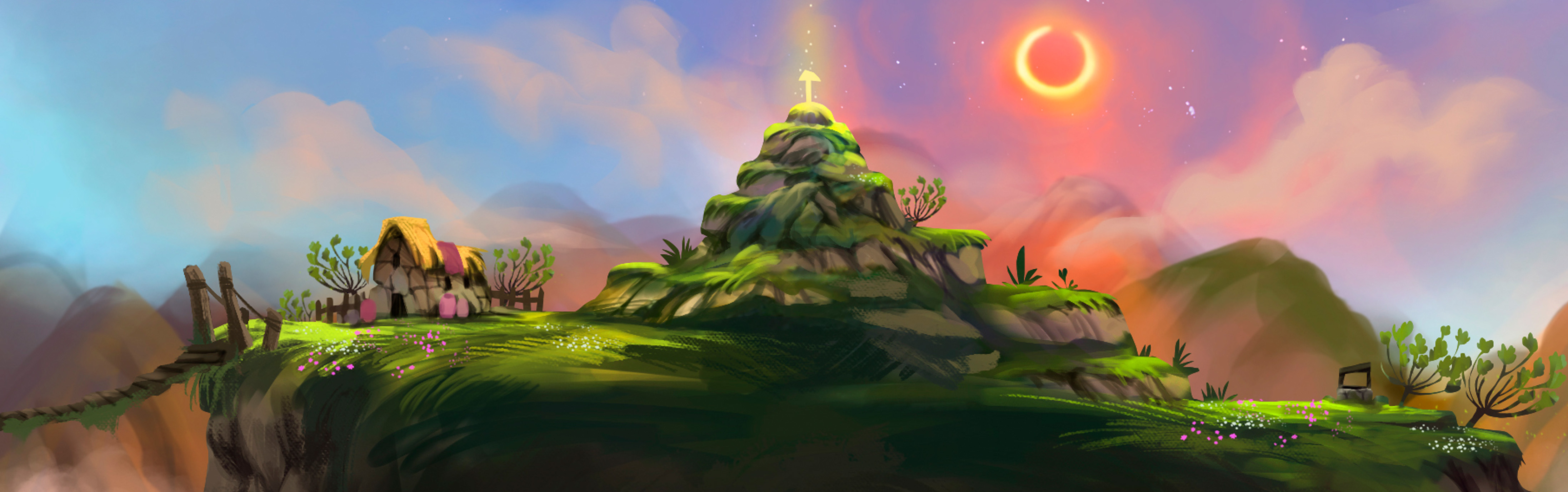 Sat at the peak of a mountain, you will find the golden spear that marks the center of the Sun’s empire, and it is here you will begin your journey to end the eternal eclipse. Izhi whom we met in the previous development diary settled down here, protected by two rising bridges able to watch over the golden spear and built a farm. Izhi’s Farm is surrounded by precipices and is the area where you will access the other environments within Imp of the Sun!