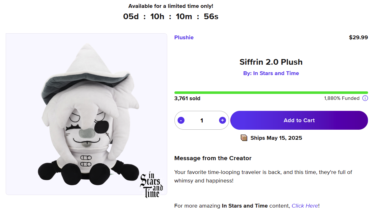 After a long wait, the Siffrin plushie is BACK!!! You have three weeks (UNTIL DECEMBER 11TH) to get your very own Siffrin! Don’t miss out this time!!! X9!!!!!