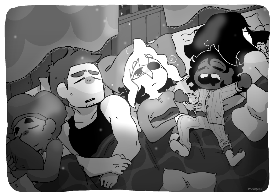 Here’s an illustration I drew a while back but only posted recently! I imagine that during their journey, everyone must’ve shared a bed at least once. This is also an occasion to show everyone’s sleepytimes clothes. Siffrin on that honk shoo honk shoo fit