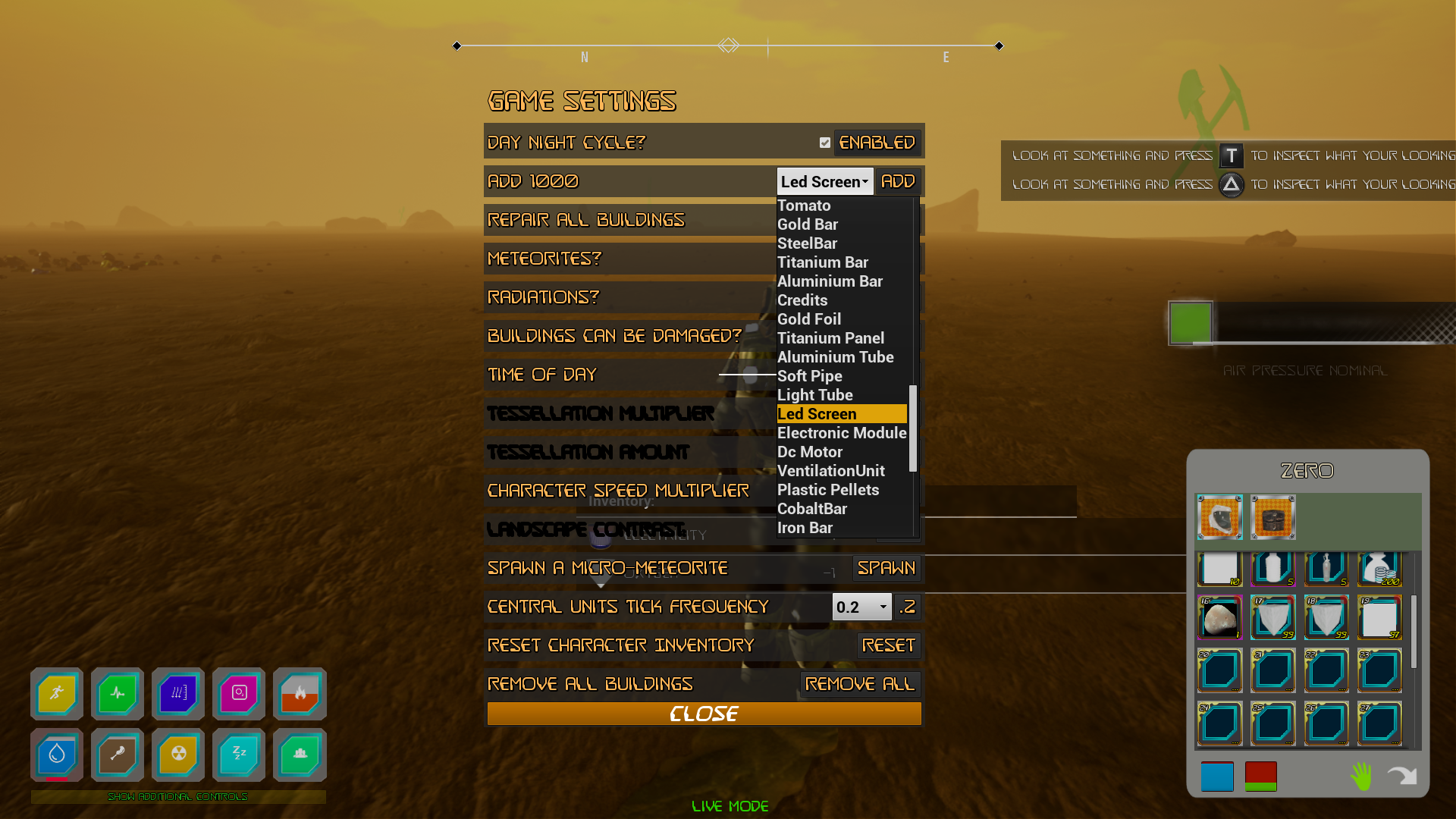A) Added the possibility to spawn the items you want in case you destroyed something for mistake or in case of a broken savegame. Consider that this can spawn anything is on the data base of the game and so there are also items that are broken or not still implemented.