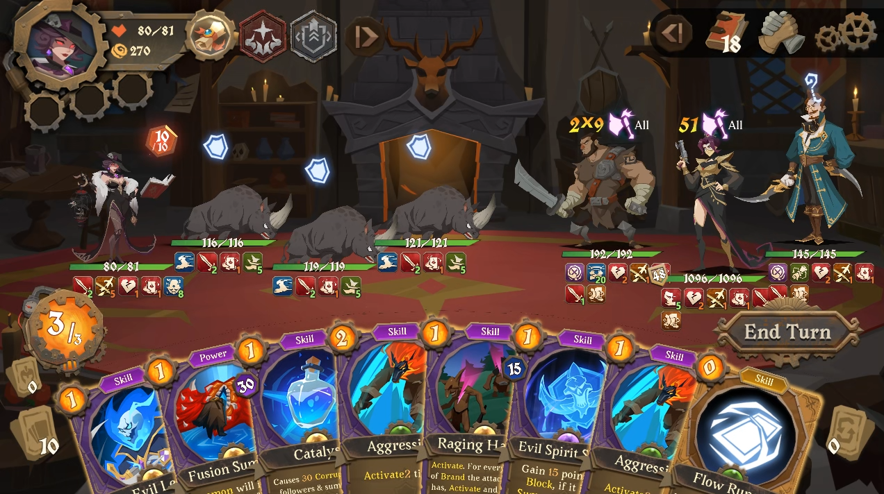 Access to all features of the new Follower mechanics where you recruit your Followers & groom your team - Select your followers from 30+ options, upgrade them and have them fight by your side. Every puppet has it specific intention in each turn. Here are a few new mechanics in the Follower gameplay