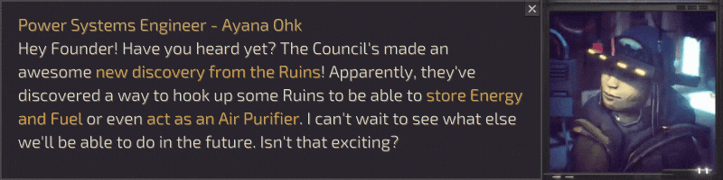 I hope you've been well since my last report. As you know, Artifacts are very important to the Council. These Artifacts allow us to rapidly advance our research and make consistent new discoveries here on Titan. In our last update to you for example, we discovered a way to activate inert ruins, which has opened up a whole new world of possibilities.