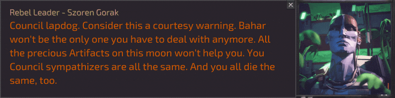 Szoren Gorak is leader of the Breakers, an organization of Rebels loosely affiliated with the Cobra Rebels (led by Bahar). He, too, despises the Council and their ways, and is a master of persuasion in getting others to join his cause.