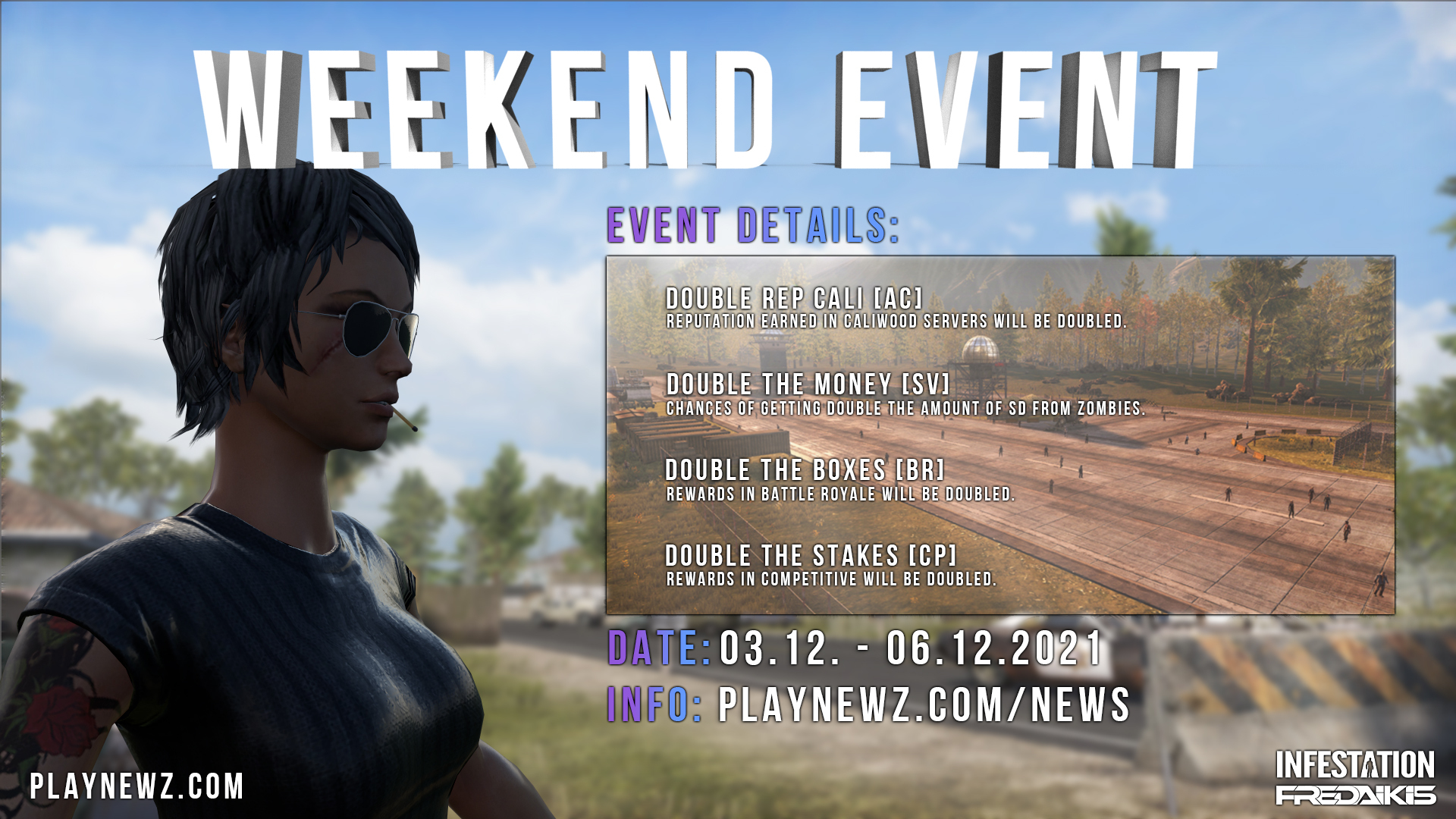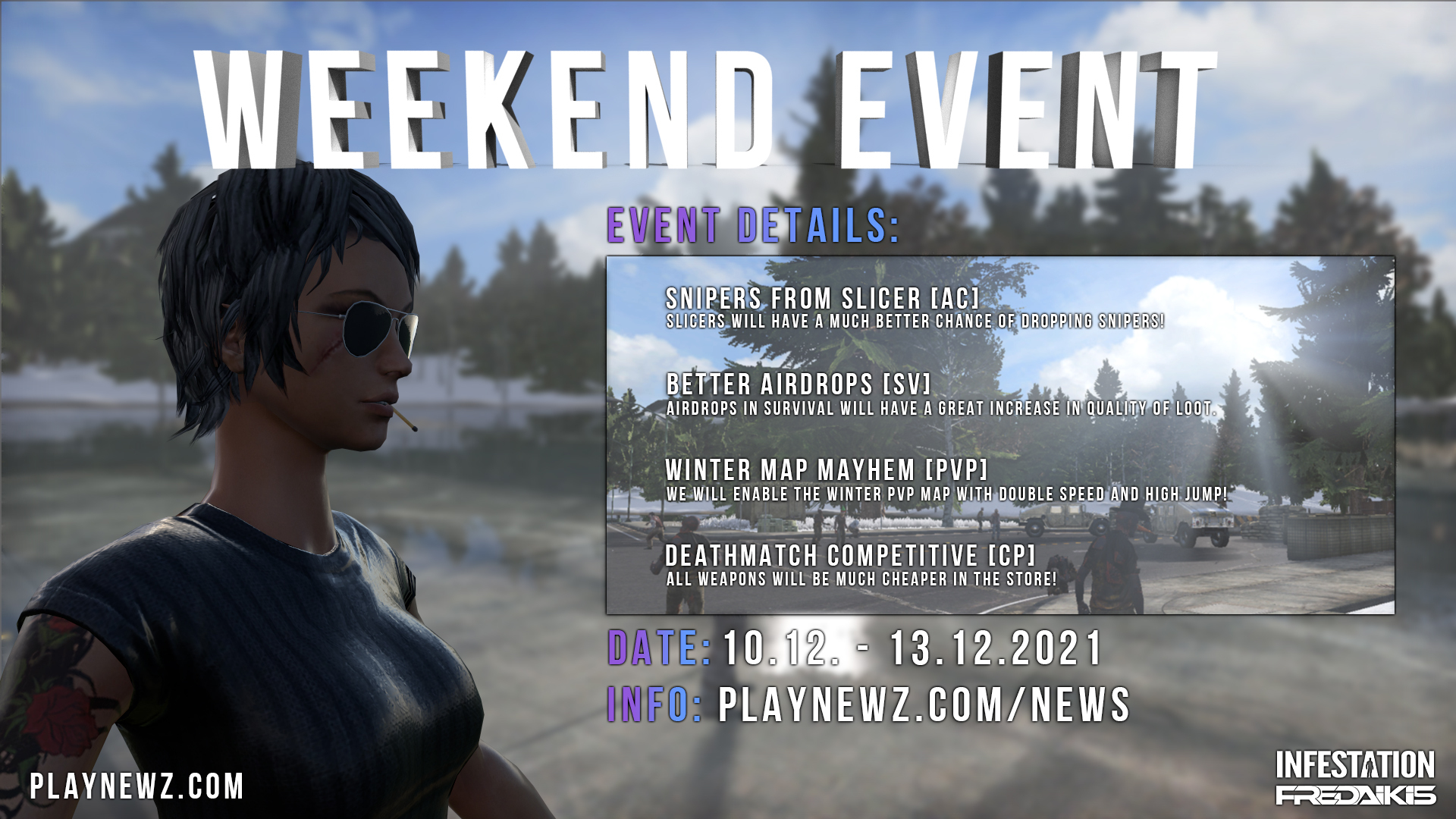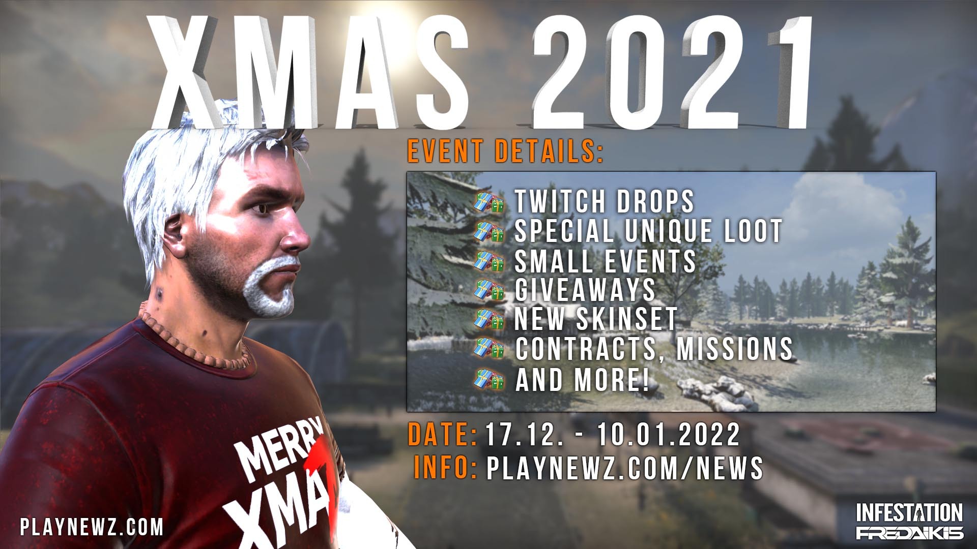 To stay updated regarding the patch and server downtime please follow us on our social media: Facebook: https://www.facebook.com/Infestation.NewZ Twitter: https://twitter.com/infestationnewz Discord: https://discord.gg/thenewz Youtube: https://www.youtube.com/c/InfestationTheNewZOfficial Twitch: https://twitch.tv/infestationthenewz Website: https://playnewz.com