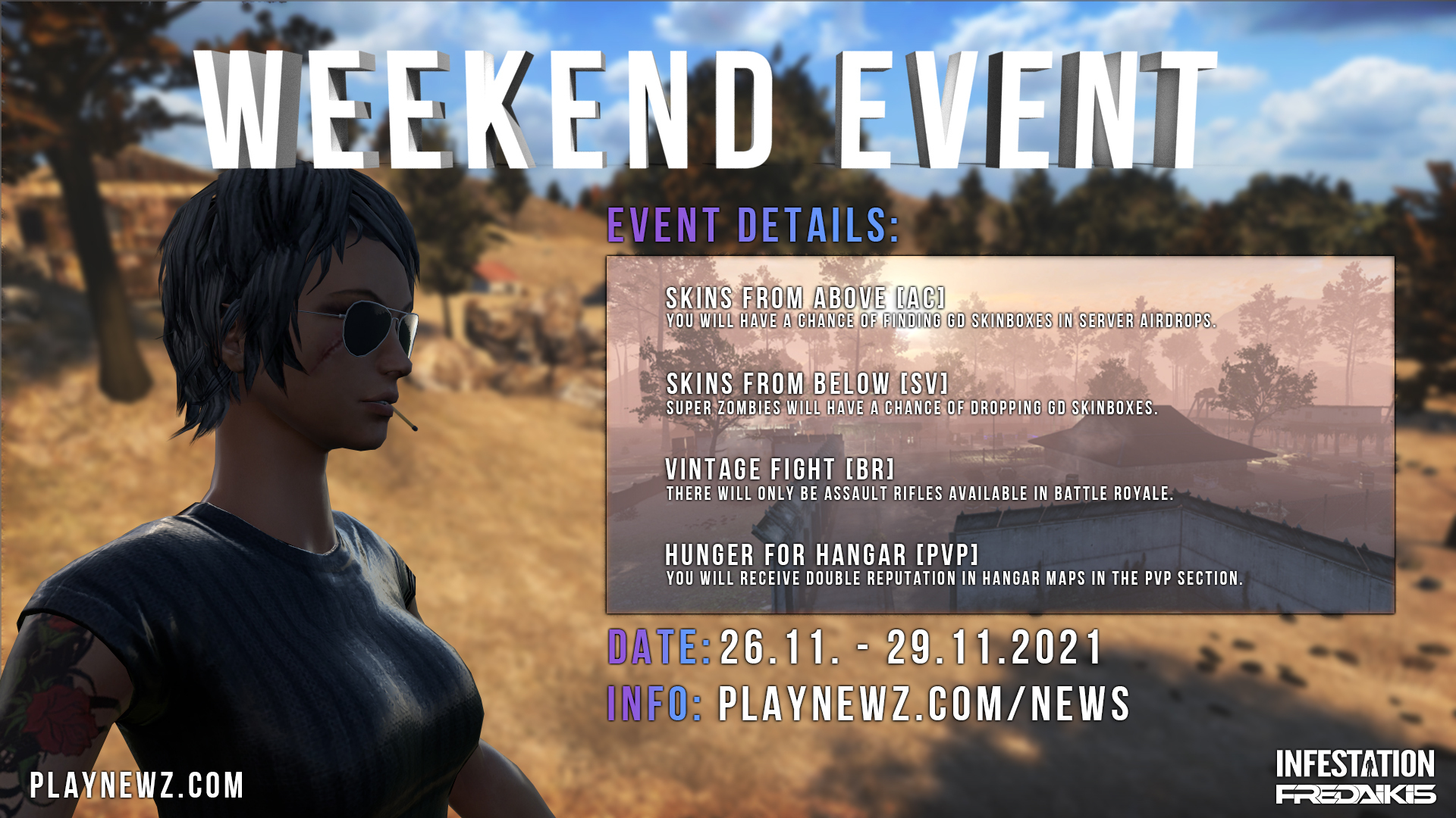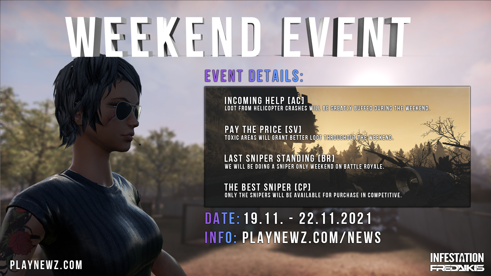 To stay updated regarding the patch and server downtime please follow us on our social media: Facebook: https://www.facebook.com/Infestation.NewZ/ Twitter: http://twitter.com/infestationnewz Discord: https://discord.gg/thenewz Youtube: https://www.youtube.com/c/InfestationTheNewZOfficial Twitch: http://twitch.tv/infestationthenewz Website: https://playnewz.com/