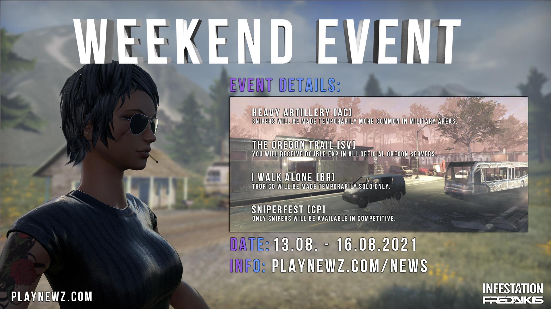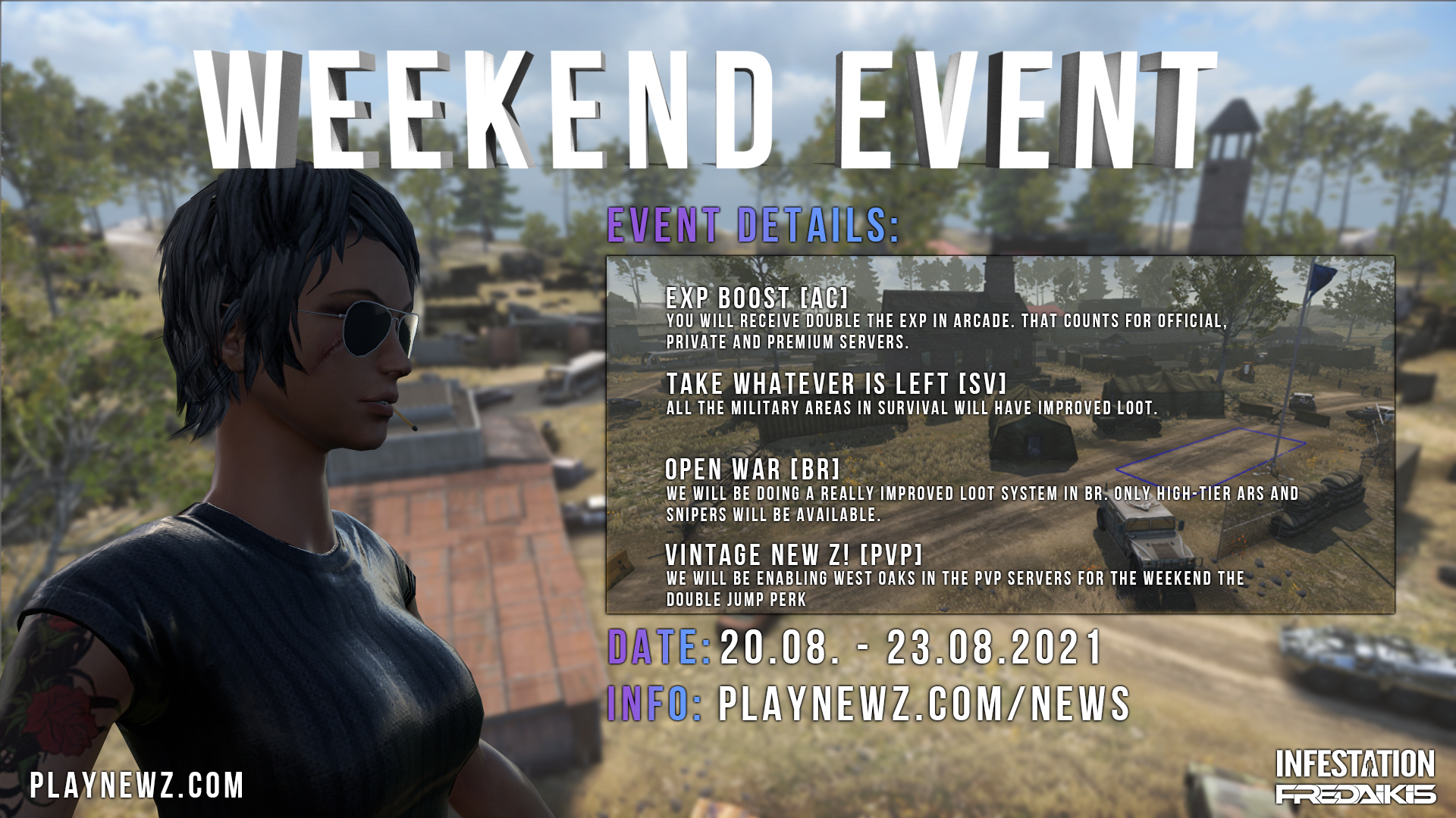 To stay updated regarding the patch and server downtime please follow us on our social media: Facebook: https://www.facebook.com/Infestation.NewZ Twitter: https://twitter.com/infestationnewz Discord: https://discord.gg/thenewz Youtube: https://www.youtube.com/c/InfestationTheNewZOfficial Twitch: https://twitch.tv/infestationthenewz Website: https://playnewz.com
