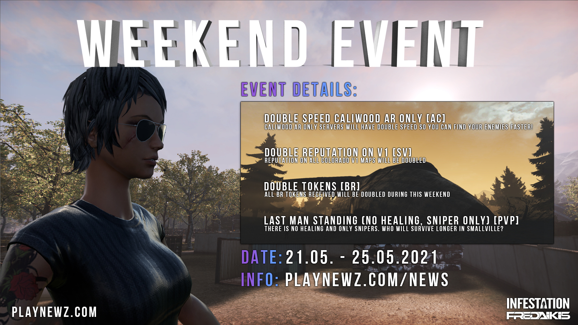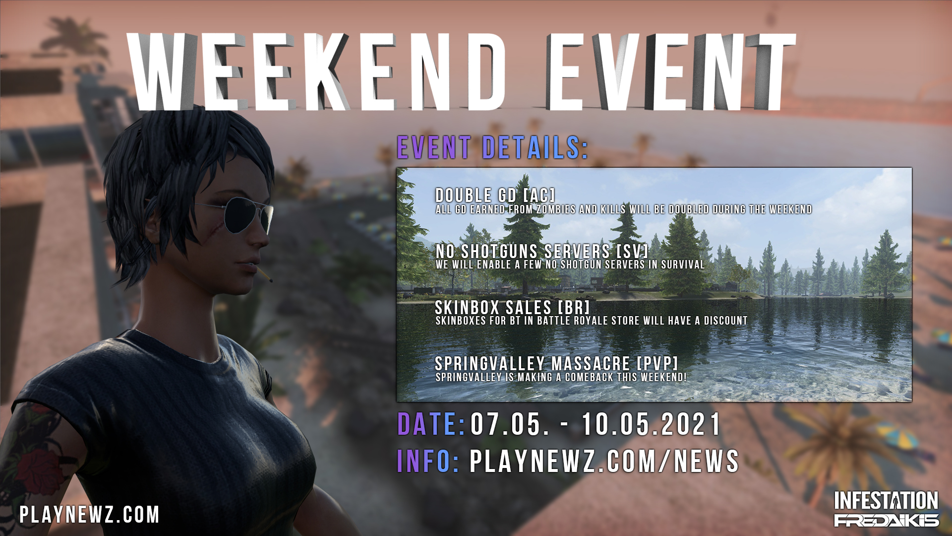 To stay updated regarding the patch and server downtime please follow us on our social media: Facebook: https://www.facebook.com/Infestation.NewZ Twitter: https://twitter.com/infestationnewz Discord: https://discord.gg/thenewz Youtube: https://www.youtube.com/c/InfestationTheNewZOfficial Twitch: https://twitch.tv/infestationthenewz Website: https://playnewz.com