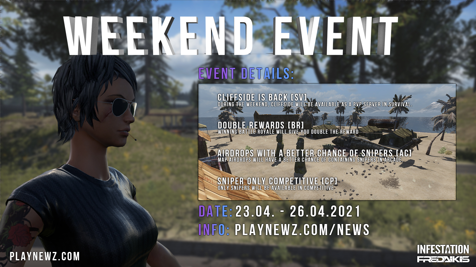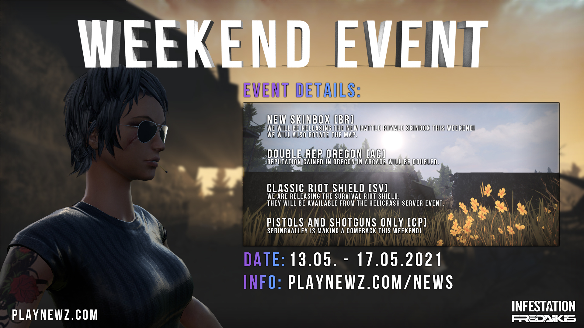 To stay updated regarding the patch and server downtime please follow us on our social media: Facebook: https://www.facebook.com/Infestation.NewZ Twitter: @infestationnewz Discord: https://discord.gg/thenewz Youtube: https://www.youtube.com/c/InfestationTheNewZOfficial Twitch: infestationthenewz Website: https://playnewz.com