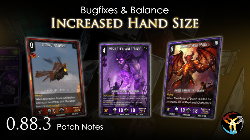 - Fixed max hand size still acting like it’s 7. - Fixed hand size modifiers being reversed in polarity in the last patch. - Fixed Vasir, the Chained’s unchained form not getting updated properly. - Filing Cabinet now requires you to have a card in hand to activate. - Demon of Dark Bargain will now discount cards in your graveyard, similar to Hellmouth Labourer. - Fixed Demonic Presence failing to add cards into both players hands if neither player had cards in their hands. - Pilgrimage Monk’s buff is correctly permanent now. - Fixed issues with Account Creation. - Added Community Set count stat to the profile screen. - Fixed issues related to the application window not flashing when starting a match.