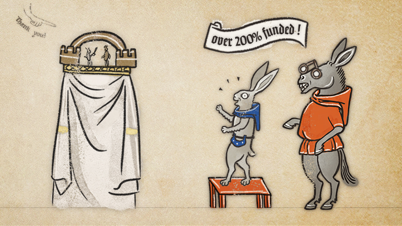 Now that we took a bit of a break and a breather, it’s time to say those special words. *CLEARS THROAT* To all our Kickstarter supporters - backers, publishers, developers and everyone who took their faith in us and took part in this crazy adventure with us - thank you!! Thanks to all of you, we collected $73,329 - that is phenomenal! We still can’t believe this sum (neither could Godfrey, but Hildegard said she had a feeling that this would be it. Damn those visionaries…). Every day during the campaign we wiped our eyes from disbelief seeing your commitment to helping us. So thank you so much for everything - the love, support, encouragement, well wishes, and everything else in between.