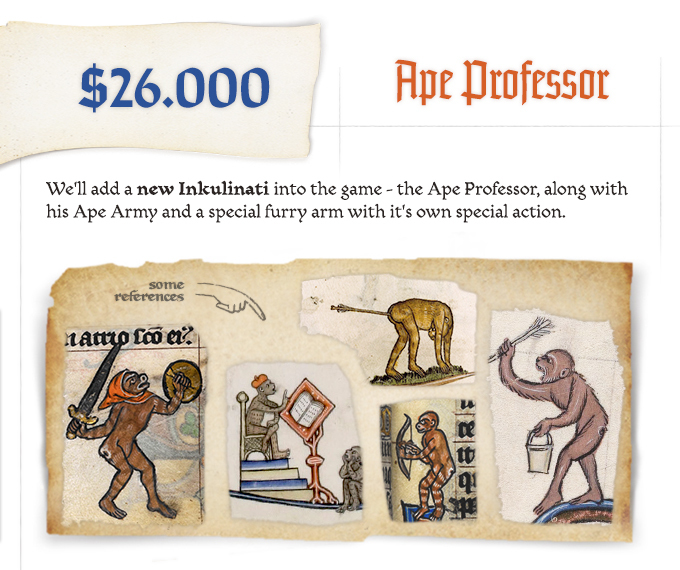 The best part is, we are aiming for more, and we have announced our first two Stretch Goals. But wait, it gets better! At the time of writing this, we have smashed our first goal and we can now confirm that Inkulinati will come with an additional Inkulinati Master - the Ape Professor! He will also come with his own Ape Army and a special hand move to boot! Check out he references below!