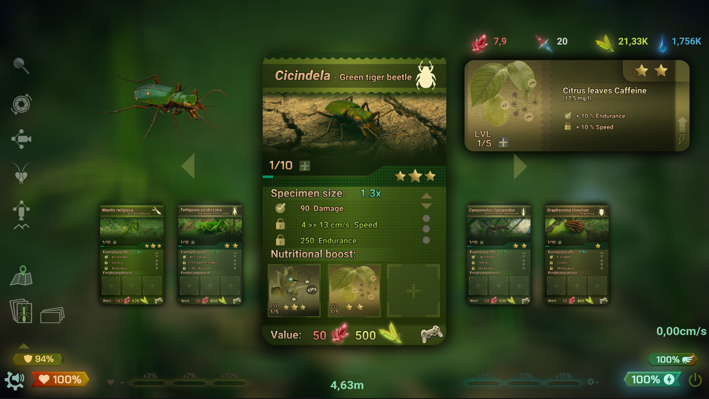The new insect selection menu and the upgrade card functionality are almost finished. Unfortunately, the release of "insect worlds" is delayed again. In order to have a better gaming experience, I decided to give more time to the development. There are other reasons as well. But a demo update with new content will appear in the next 2 weeks. Including the insect selection menu, another insect, and the lexicon. I will keep you up to date.