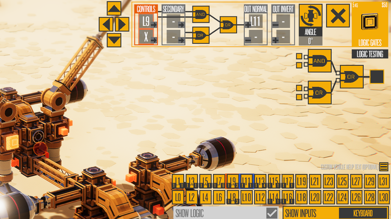 There are 2 or 4 inputs for parts that receive inputs, and 4 outputs for parts that have outputs (only the 5 new logic parts so far). Note that there's a lot more detail to remapping controls, but the important thing is knowing which control is active/remappable. The active control has an orange outline, and that active control is what will be remapped when you click on an input (logical or physical). It's a bit confusing at first, but here's a quick way to see how it works...