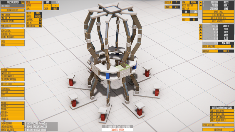 Version 0.150 is finally nearing release. Today I'll be working on the last significant feature (importing custom meshes), but that's actually one of the least difficult parts of adding custom ground meshes. Just supporting custom meshes at all, and allowing some editing of their placement/scale/rotation, was completed yesterday, along with letting you place prebuilt meshes like ramps, boxes, and spheres. Workshop support ended up being the biggest task by far this time around, as supporting workshop structures within islands (which can also be on the workshop) was more complex than I first realized.