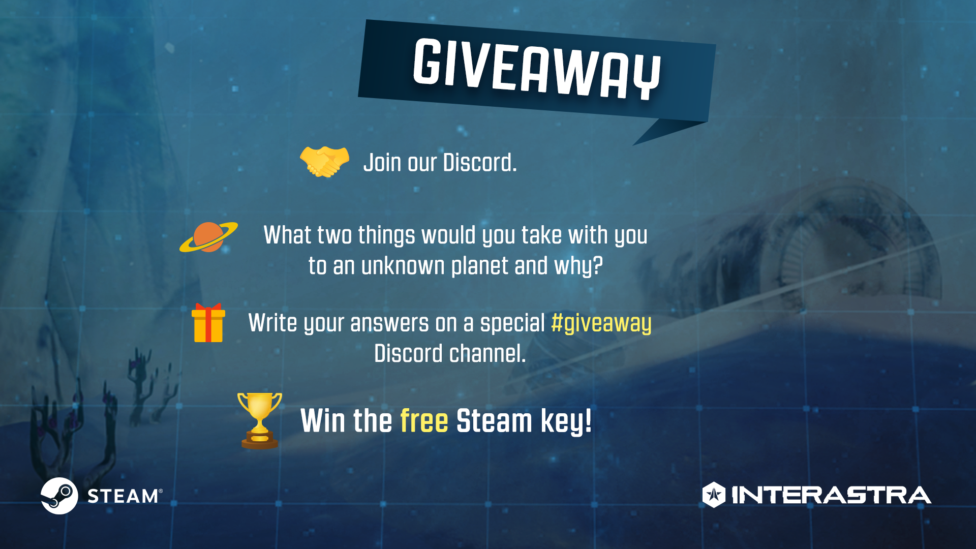 🎁 GIVEAWAY! 🎁 On the occasion of the INTERASTRA’s Steam Early Access premiere, we have prepared a competition for you! Answer the question on the dedicated Discord channel and earn a free Steam code! 🎮