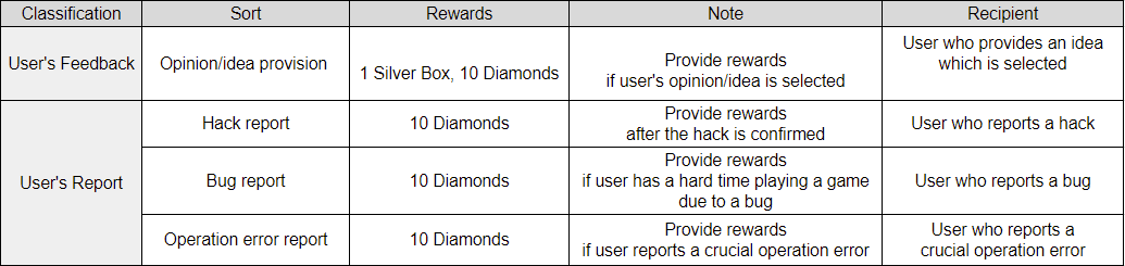 - Those who already received and used rewards : We will take back the diamonds you have used and every items you purchased with the diamonds. We will provide rewards again with the current unit.