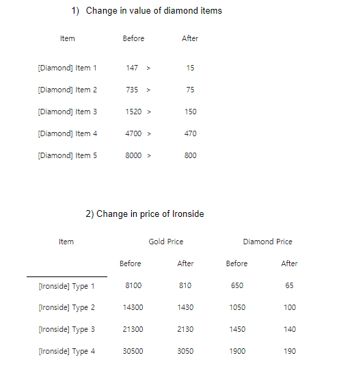The unit of currency is decreased and some items’ value is slightly adjusted.