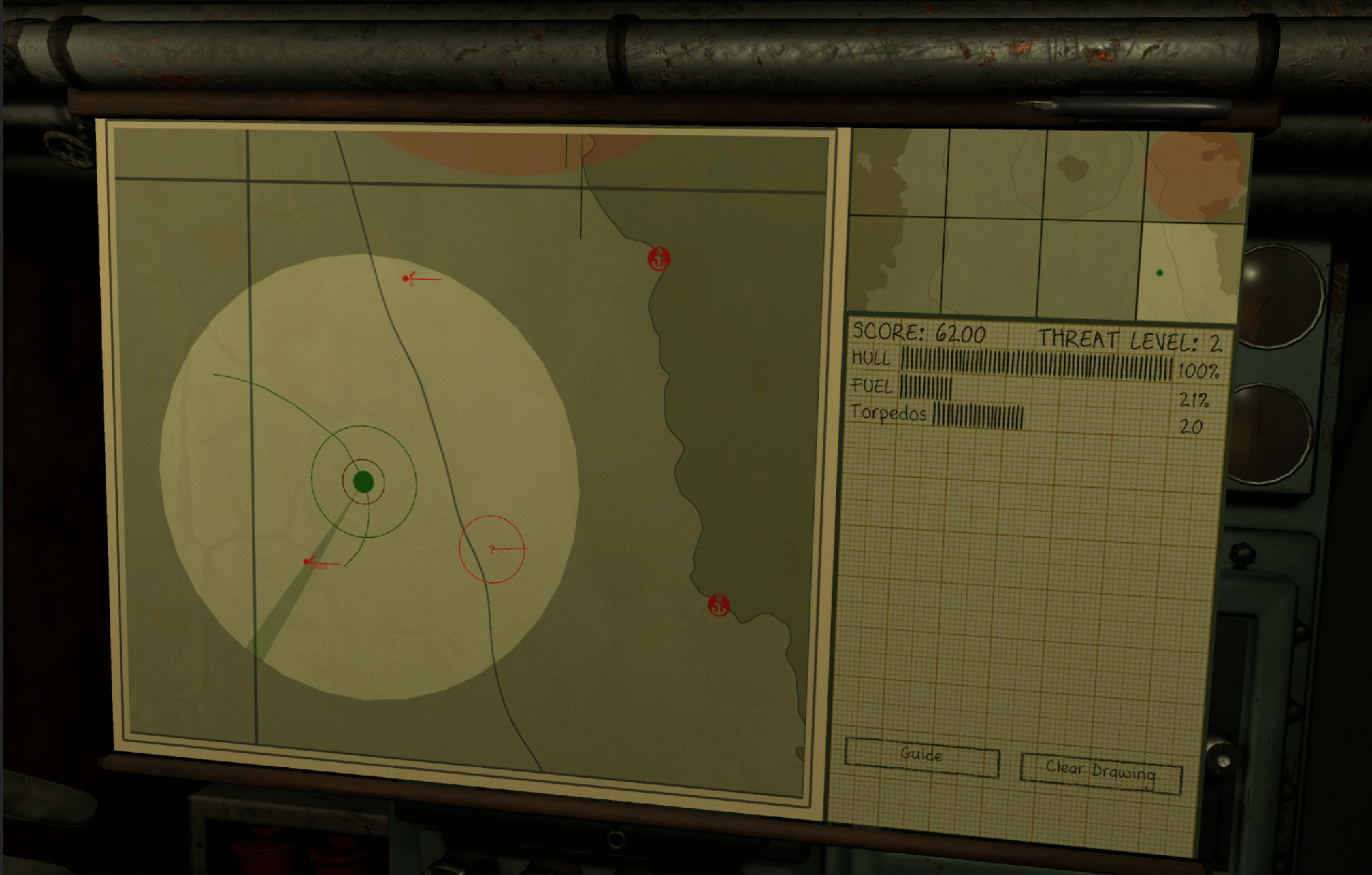 We’ve also improved and re-worked the torpedo targeting system on the Torpedo Data Computer. The Torpedo Computer display will now show a top down view of the targeted ship with colour coded zones indicating how vulnerable that area of the ship will be to torpedoes. The torpedo depth can be set using a new dial on the Torpedo Computer and the top down view will update to show a cross section of vulnerable zones at the selected depth. Successfully hitting a red flashing zone with a torpedo will destroy the vessel. This part of the update is key for us to introduce different enemy types to the open world in future updates.