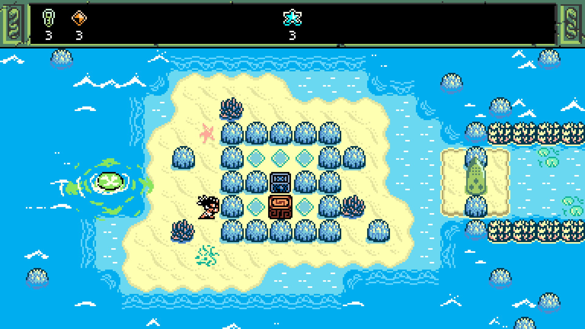 Stone god screen: Right side green key puzzle tweaked to make the two solutions work better for their intended purposes. Casual players will have an easier time setting up the intended default solution that requires pushing the right most wood block down to be broken, while the alternative solution still allows skipping pushing the wood block down, making it a fast / easy solution but harder for new / casual players to see. It also teaches that stonies can push stone blocks.