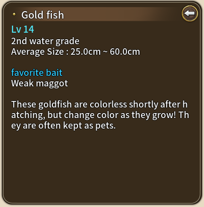 -The fish description section of the item book has been modified to display the average size and favorite bait. -New fish will appear in actual size. Previously released fish will remain at their previous size.