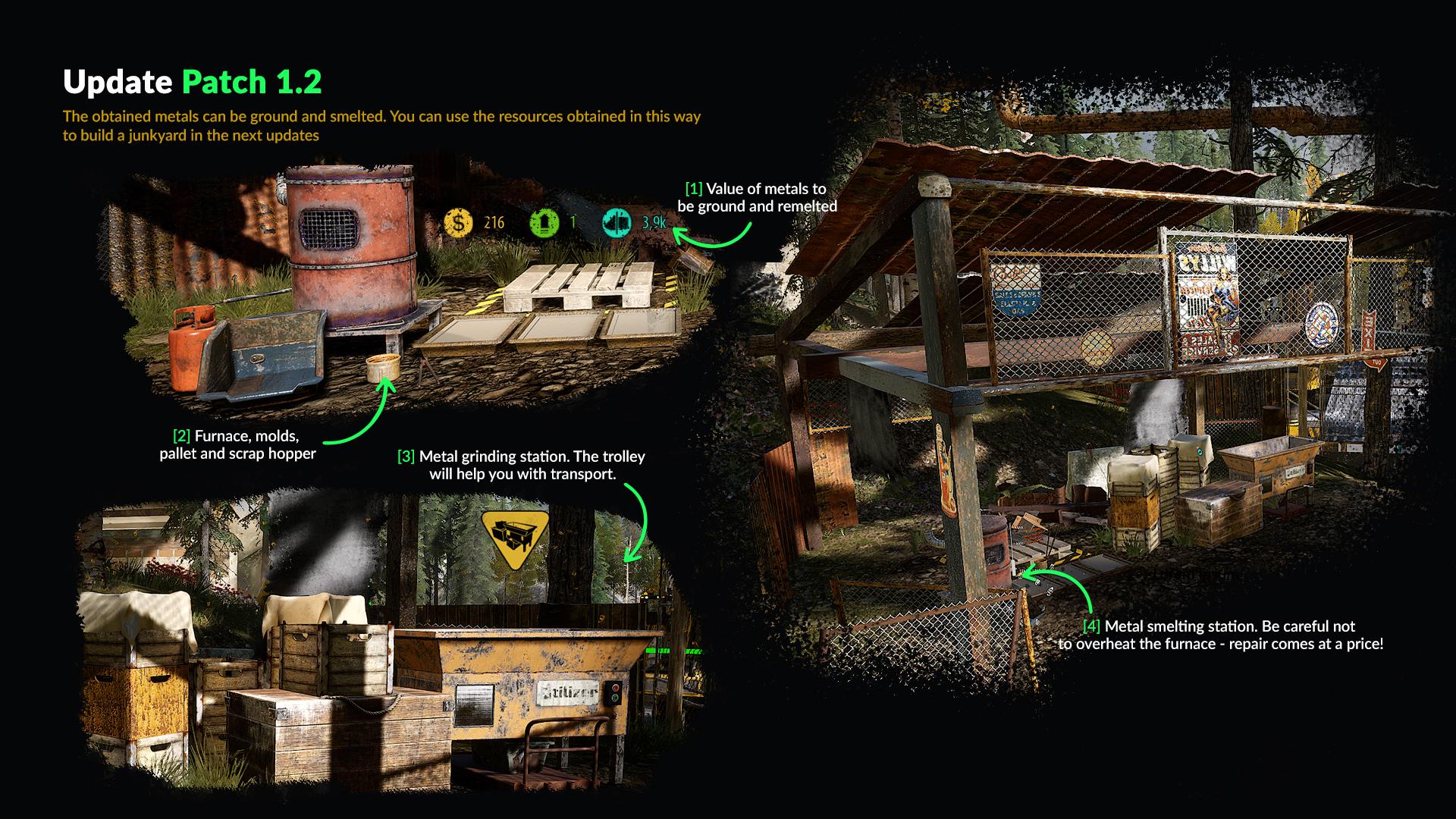 Patch 1.2 includes new game mechanics: - Metal smelting station - Furnace, molds, pallet, and scrap hopper - Metal grinding station - Junkman's Hammer is now available at the upgrade station