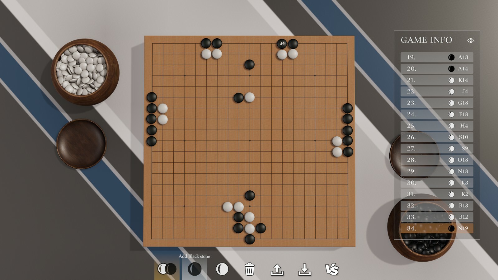 Adjusted AI difficulty for 19x19 games, lowered the Beginner and Novice difficulty, enhanced the Amateur dan level AIs.