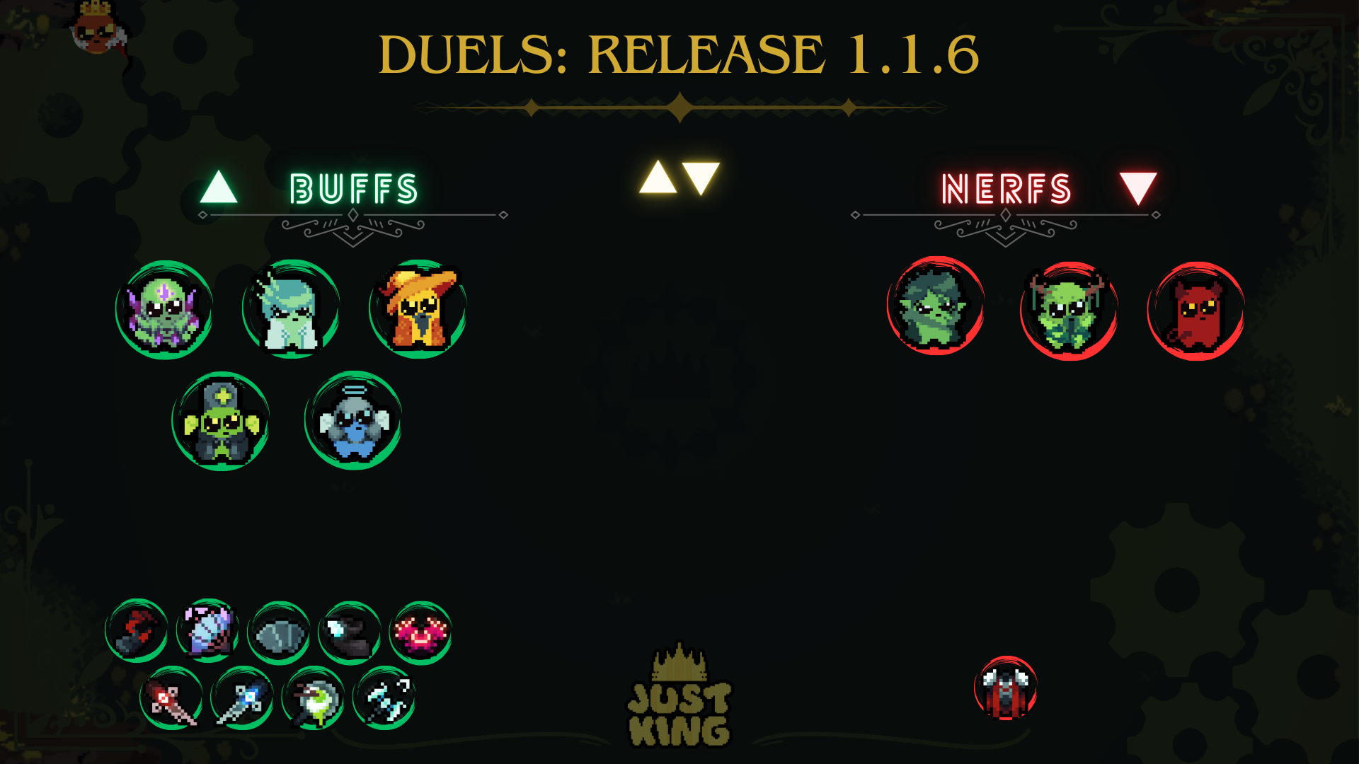 This patch we are removing the requirements on item and hero unlocks for duels so new players can compete on equal standing with veterans. We also reworked "Father of Kaiju", the achiev that caused most headaches for both players and our development team, horay!