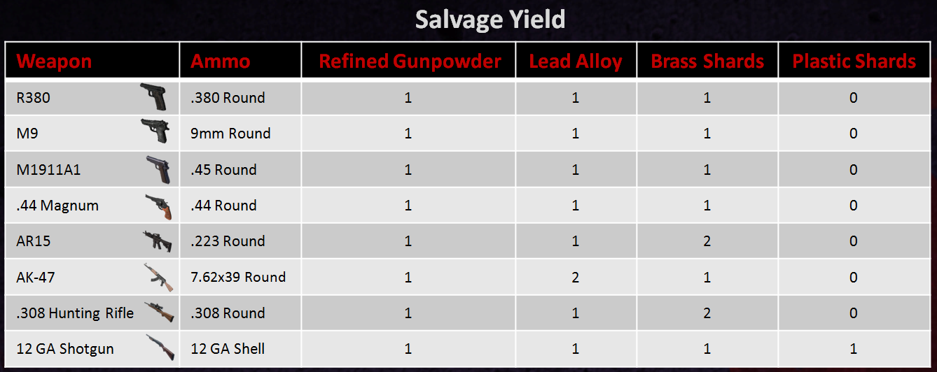 With respect to bulk, we want to make sure you weren’t doubling your carrying load (or worse) when salvaging bullets, so we’ve reduced the bulk cost on Gunpowder to 1. Brass Shards, Plastic Scraps, and Lead Alloy will cost 0 bulk. This will ensure that all ammo can be broken down without dropping any parts. In fact, from a carrying point of view, it will be advantageous to break down some ammo (such as shotgun shells or .44 rounds) as they will end up costing less to carry when broken apart. Just remember it will cost more to re-assemble them later!
