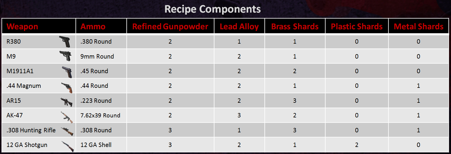 We really wanted the process to feel similar to how other item salvaging/creation works in H1Z1: Just Survive. As such, ammunition can be salvaged with a right-click interaction for a variety of materials -- Gunpowder, Lead Alloy, Brass Shards (and Plastic Scraps in the case of shotgun shells). Also important is ammunition recipes can be discovered with these materials. Once discovered, they can be crafted at the new Weapon Workbench, which will be coming in a future update. The Weapon Workbench is a brand new crafting table (recipe must also be discovered) which can be placed once crafted Note that all weapon-related workbench recipes will be moved to this table as well.