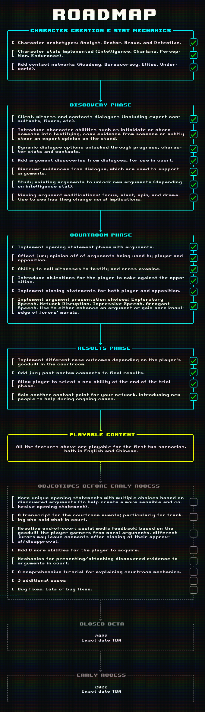 After two years of developing(And tons of coffee consuming), in this time we've come very far! We've built the core mechanics. But we are just two guys, there are still a lot work left to do. Here is our road map: If you like the game and our ideas, please go to our Kickstarter page and back us, help us to make this happen! You can join our Discord Channel to talk to the devs, share your ideas!