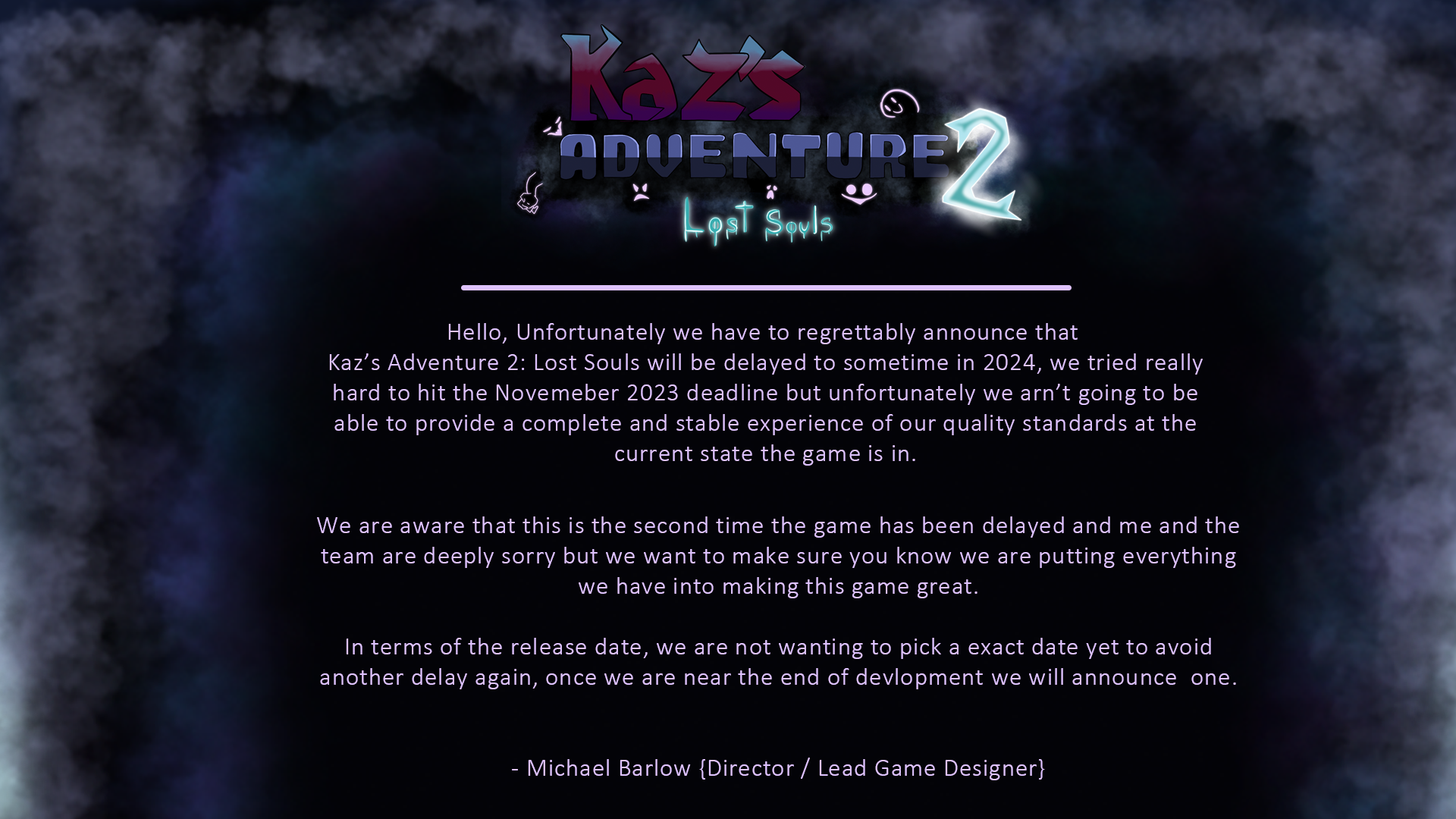 Kaz's Adventure 2: Lost Souls has been delayed to sometime in 2024, check the below image for more info!