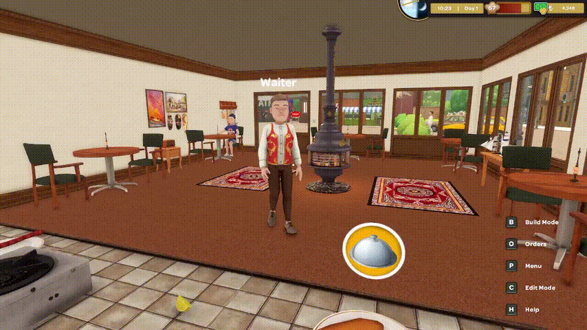 As you can see above, there is a plate marked as ready to serve! Players are able to mark dishes they prepared with current active orders. When a plate is marked, an icon appears on top of the plate and any available waiter will take it to the corresponding table.