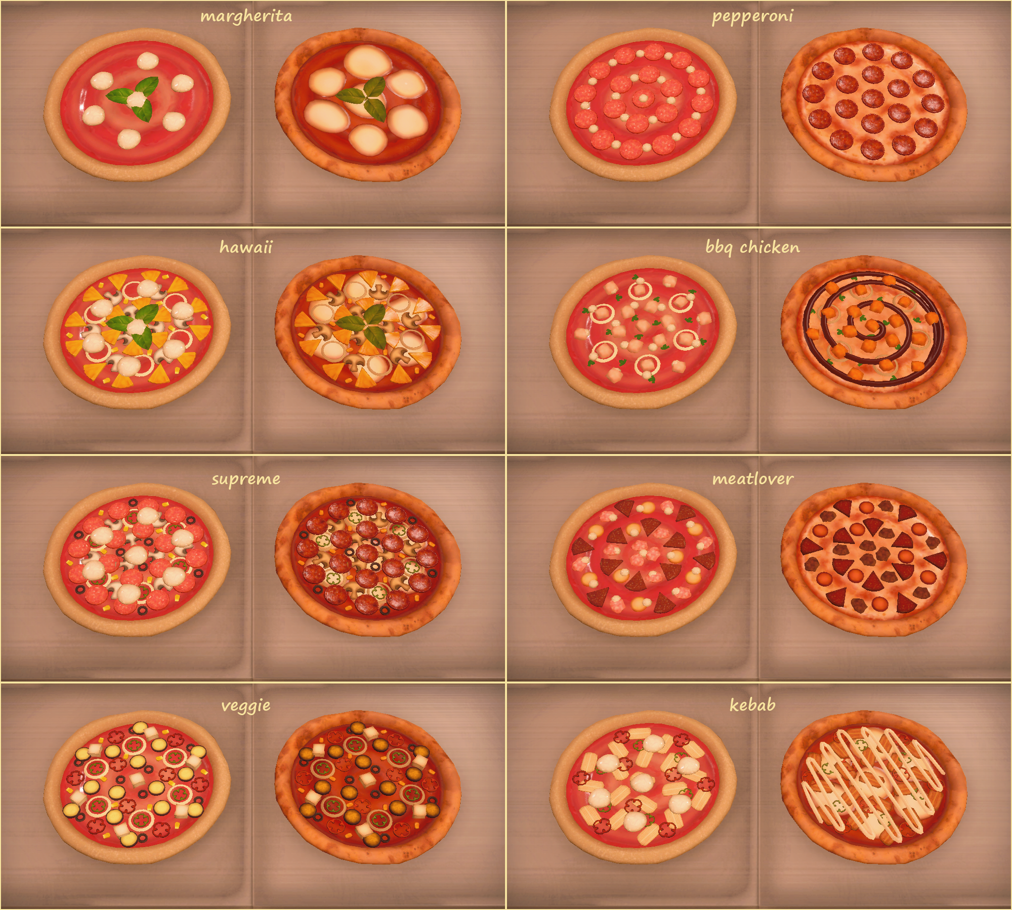 As mentioned above, Pizza's will have it's own tag. So we said "there should be more pizzas!". As a part of our new menu system, we are adding even more pizza recipes with more variety and ingredients! You will be able to use sauces and meats for your pizza recipes now. Also we made some visual improvements for our existing pizza recipes.