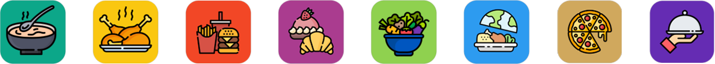 Bakery - Chicken - Fast Food - Kebab - Luxury - Pizza - Soup - Vegetarian - World Cuisine