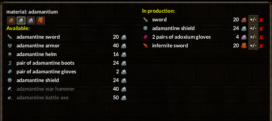 What was previously stopping me from adding new materials was the workshop UI. Requiring listing every new item/material pair, it would become quite unreadable. After a bit of research, I’ve ended up adding simple tabs to the menu, which you can see in the screenshot above. They’ll help a lot in finding your desired item.