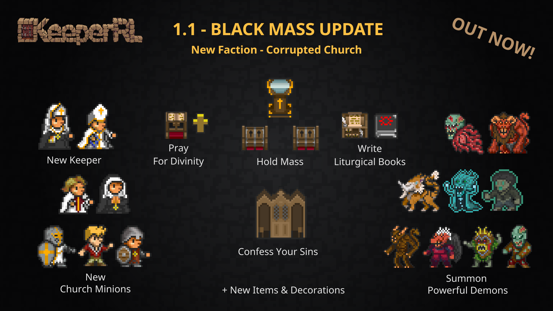 The KeeperRL team wishes to entertain you this Halloween by releasing a new playable faction called the "Corrupted Church". Playing either as a Bishop or a Mother Superior, you will build a church for yourself and your congregation, hold Masses, pray, and craft devotional items. However, the KeeperRL world won't allow you to stay holy. Soon enough you will start to give in to temptations, such as luxury, alcohol, courtesans, and dark crafts. Before you know it, you will perform Black Masses in the name of the Evil God Adoxie, summon his minions, and do other, terrible deeds.