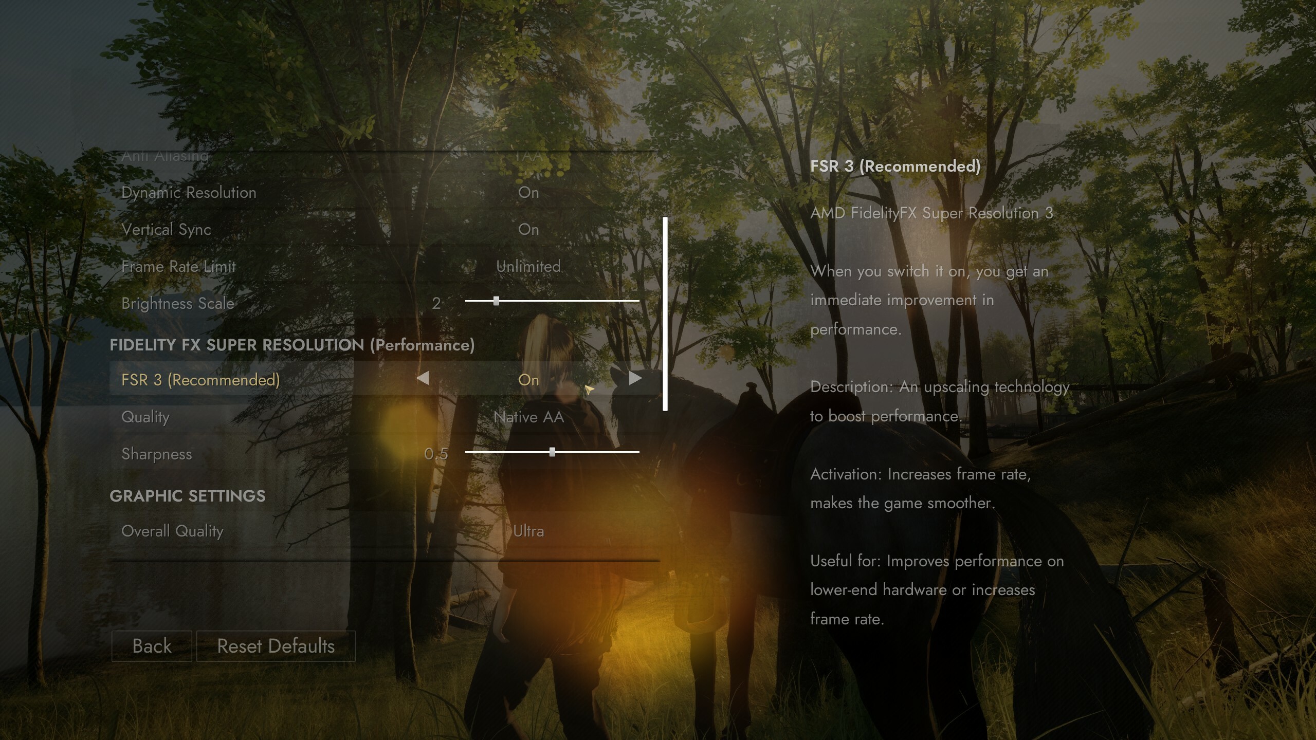 For the best performance on Ultra settings, we recommend enabling FSR along with native AA and a sharpness setting of 0.5. Optionally, you can also set shadows to medium for further improvements.