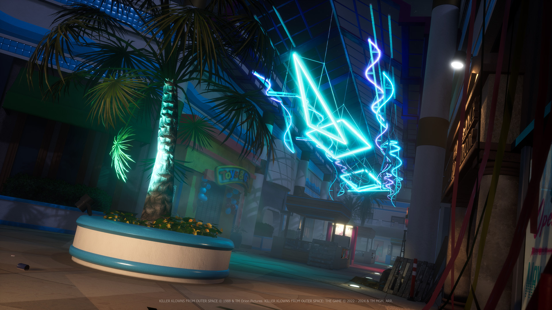 Shop til you drop (dead) in this 80's neon retail utopia! Peruse through the trendy stores while you run for your life! Stop by the salon so you can look your best for the Klownpocalypse! There's no shortage of shops, eateries, and entertainment as you wind through the different wings and levels of the Crescent Cove Mall!