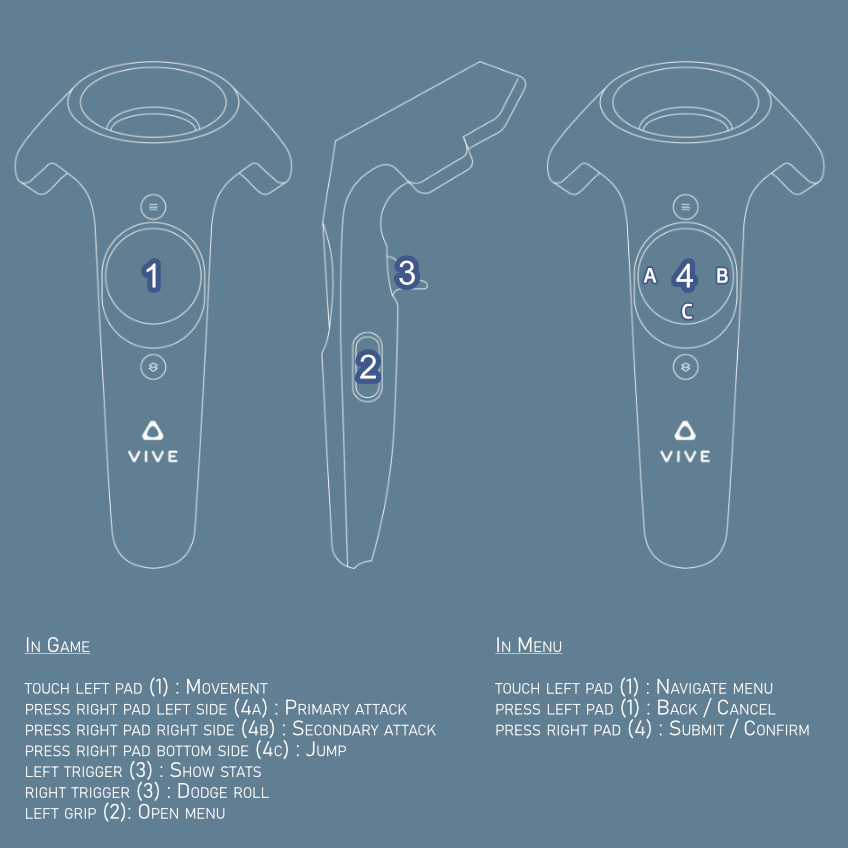 Tracked Motion Controller support. Experimental / as-is support for using tracked motion controllers for input in OpenVR, this requires you to set the -UseTrackedControllers flag in your launch options. This is not an ideal way to play, but it can be enabled just in case you don't have a gamepad and still want to try it out in VR. Keep in mind that the input system was not written for this and rebinding does not have different icons for left and right controller, and it might be awkward to say the least. Below is an image showing the default mapping for tracked controllers (remapping menu buttons should be avoided as this will interfere with SteamVR, Oculus and MixedReality portal operations.)