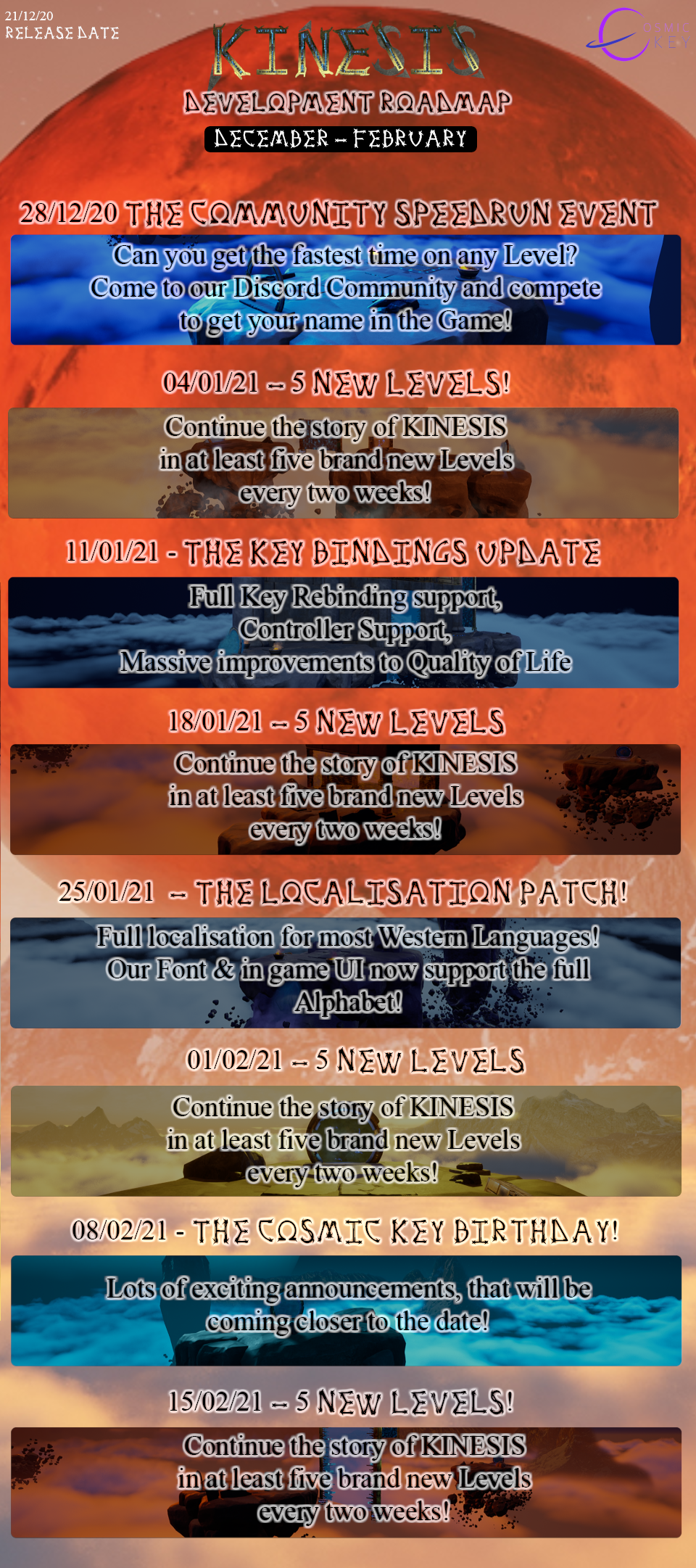 Currently the plan for us here at Cosmic Key is as follows: Alexis is continuing to work on KINESIS making more incredible levels & lots of much needed quality of life & amazing visuals (checkout Level 30, he genuinely took my breath away) and once Alexis has made more progress I will put together another Content Roadmap for us to follow. I do have to admit; we missed the Key Binding & Localization Patches for KINESIS, I am well aware of that. We do still plan to have those complete and released before the end of the year.