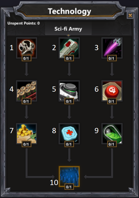 The Tech Trees in its origin are pretty simple, and is somewhat similar to tech trees from other games. However how you get the points to spend might be a bit unfamilliar, since we didn't want to give players with the upper hand even a greater advantage. This resulted in every player recieving a point every 5th minute no matter what.