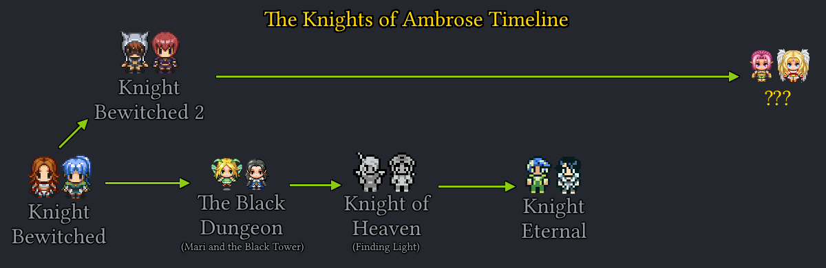 My next game will *likely* take place in this alternate timeline, around a century after the events of Knight Bewitched 2, and on a new continent in the world of Ambrose. This setup gives me an opportunity for a fresh start while still being able to connect the new story to the previous one.